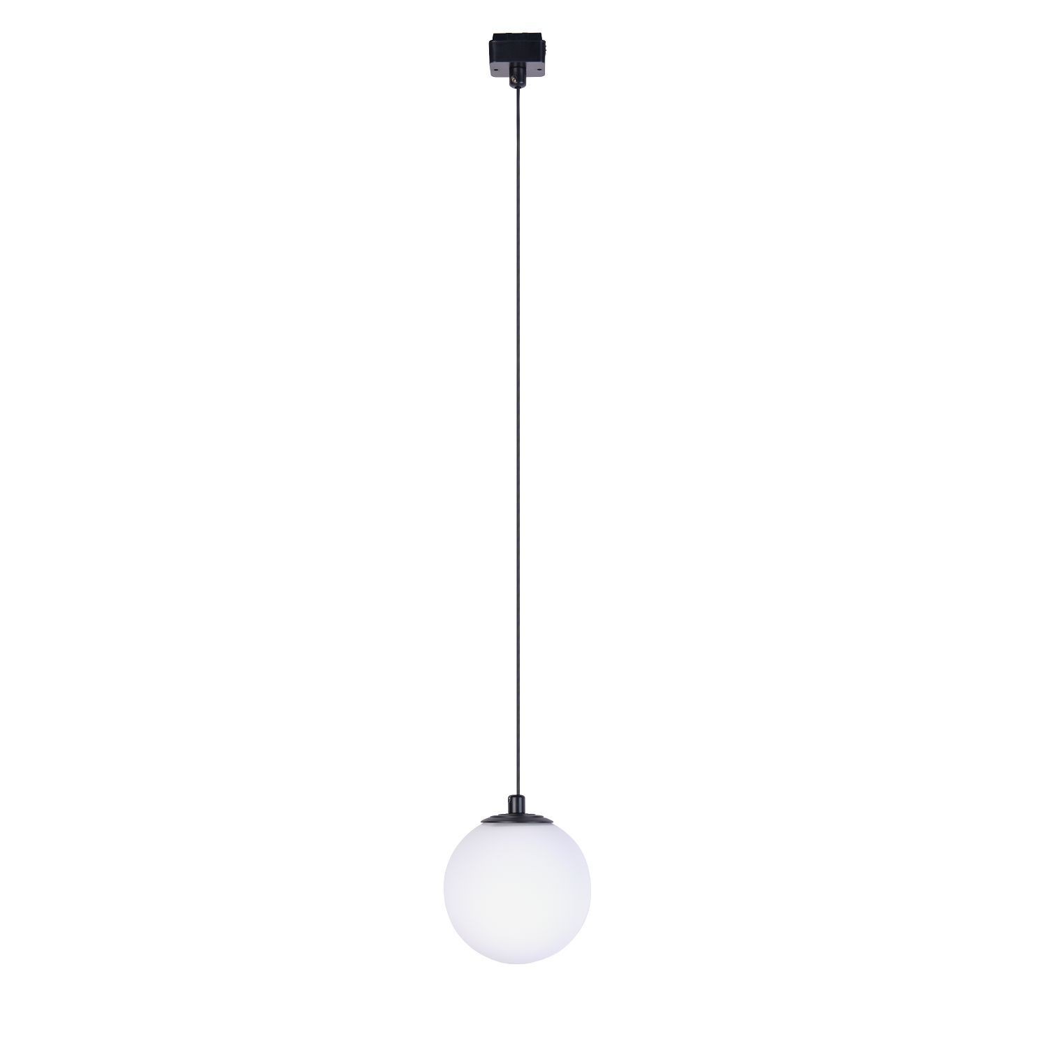 Подвесной светильник на шинопровод черного цвета с плафоном из белого выдувного стекла.