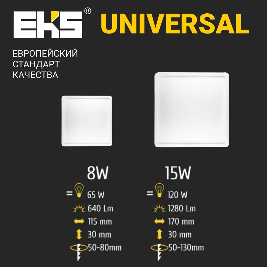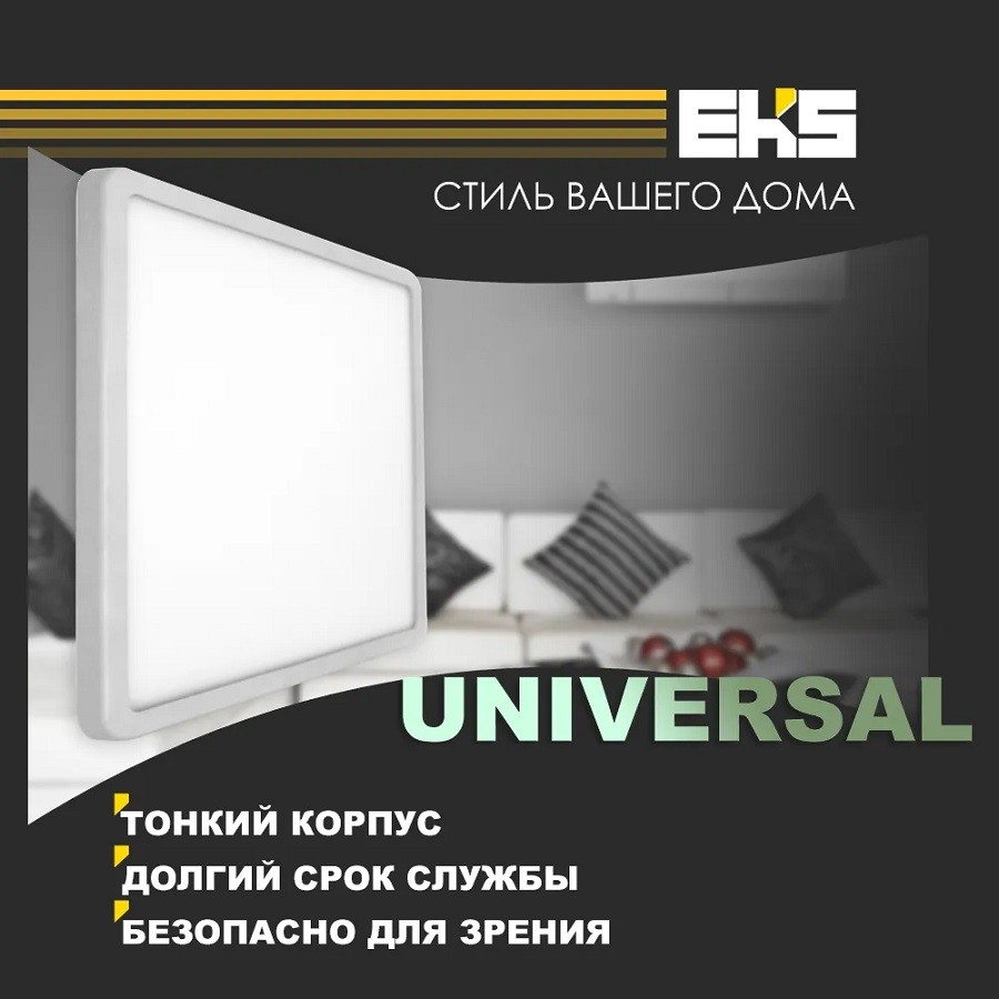 Встраиваемый светодиодный светильник EKS UNIVERSAL для основного, декоративного и акцентного интерьерного освещения. Универсальная LED панель подходит для натяжного потолка и любых подвесных конструкций. Светодиодная панель имеет равномерный яркий свет без пульсаций и мерцания. Не утомляет и не раздражает глаза. 15 Вт, 1280ЛМ, 4200К.