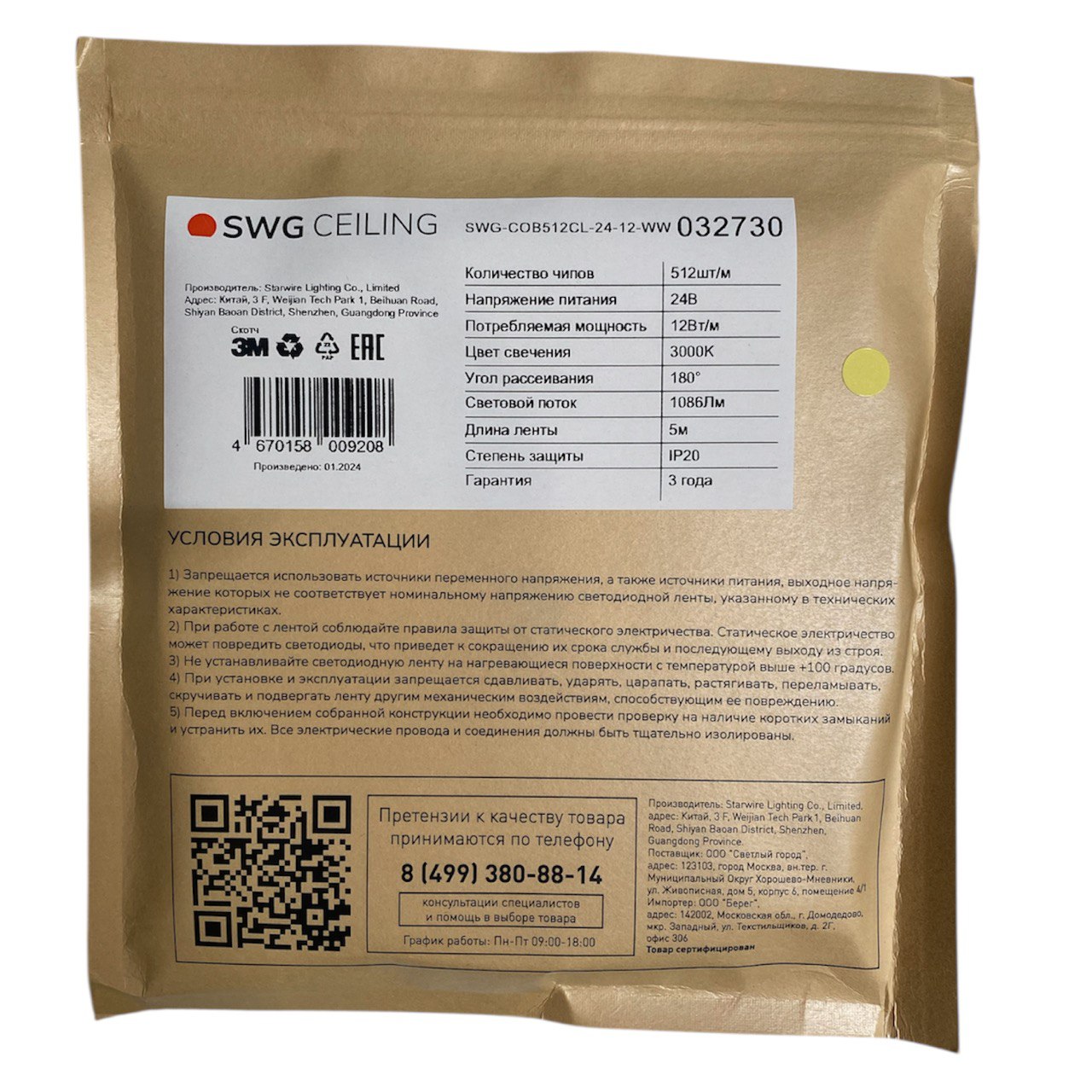 Светодиодная лента SWG ceiling COB (12ВТ/м) 24В 512 д/м 3000К 1086Лм теплая (31)