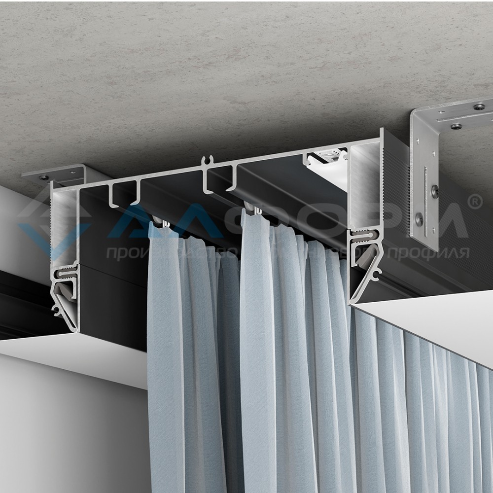 Скрытый «П-образный» карниз с алюминиевым бампером, подсветкой и креплением натяжного потолка в одной плоскости. Цвет профиля: черный и белый