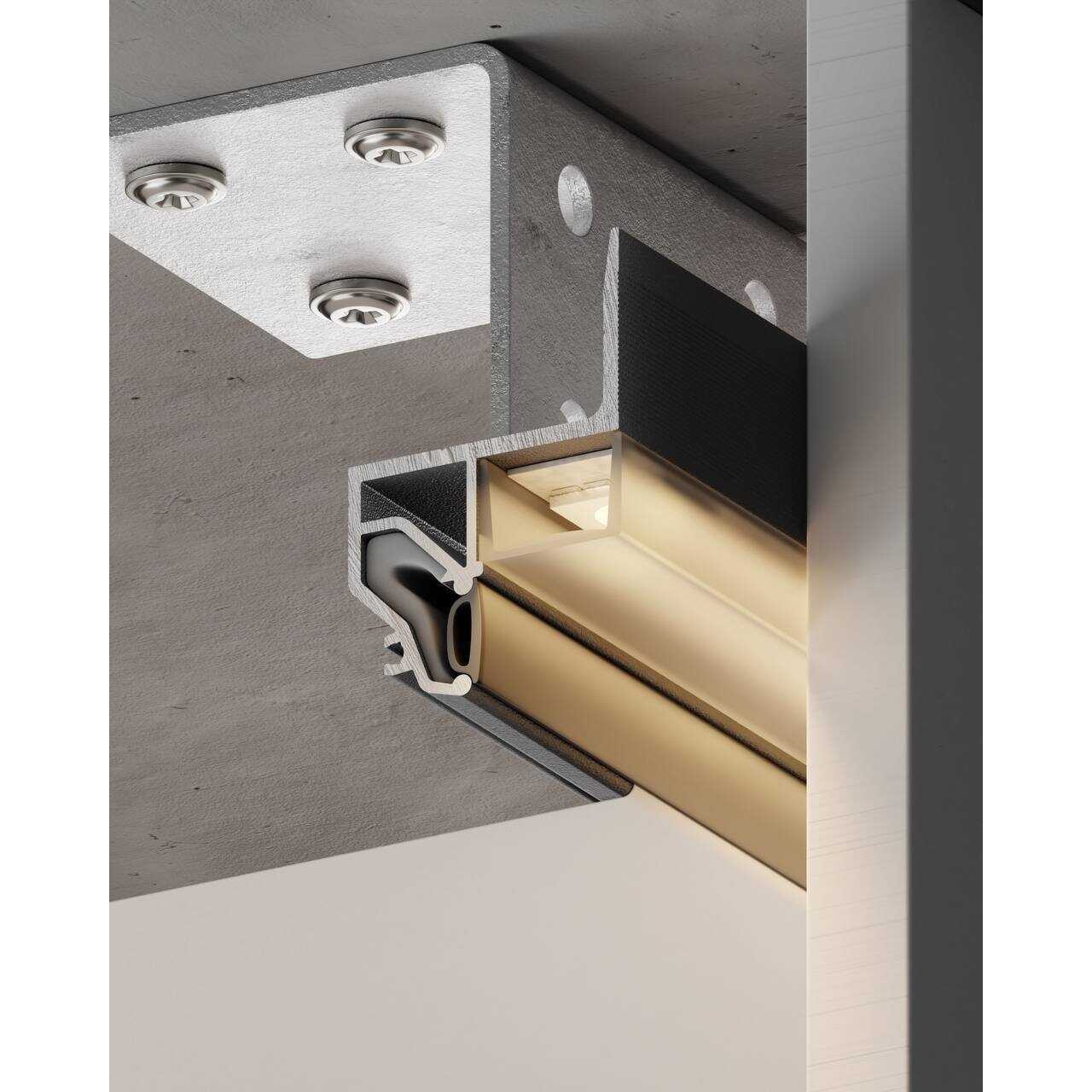 Конструкционный парящий профиль для натяжных потолков с гарпунной системой крепления полотна, паз под гарпун закрывается вставкой. С полкой для светодиодной ленты и креплением для светорассеивающей вставки. Добавлена камера для вкручивания саморезов.
