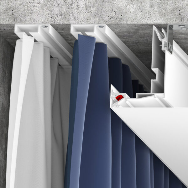 Вкладыш VMK01 представляет собой гардину белого или черного цвета с одним рядом для крючков и местом для установки подсветки. Он устанавливается в профиль MK01 и закрывает пазы для крепления гарпуна. Возможна установка светодиодной ленты и рассеивателя для подсветки штор. Освещение от подсветки распространяется вертикально вниз. Конструкция профиля предусматривает фиксацию полотна при помощи гарпунной системы крепления.
