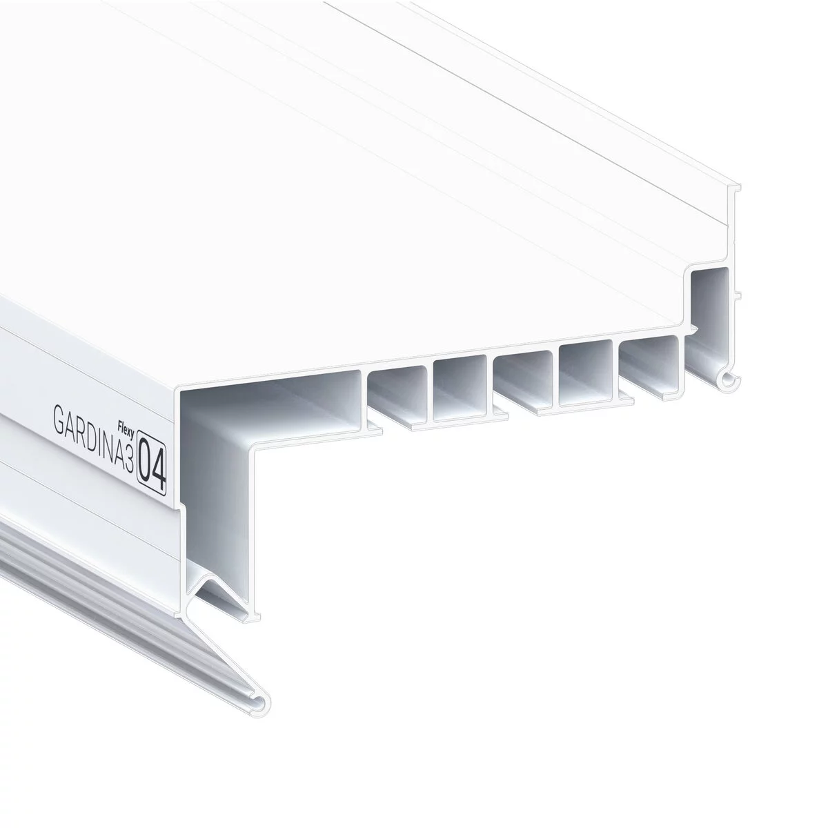 Профиль Flexy GARDINA3 04 для изготовления скрытых карнизных ниш с тремя пазами для установки штор и гардин. Для гарпунной системы крепления полотна с нижней заправкой.
