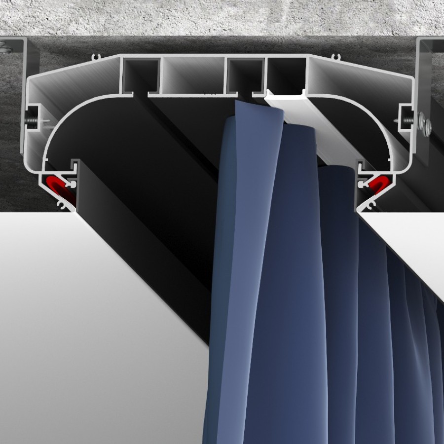 Разновидность дизайнерского карниза. Он представляет собой цельнометаллический профиль белого или черного цвета с двумя рядами для крепления крючков. Обладает увеличенным размером между рядами для крепления штор. Карниз имеет оптимальную ширину, для того чтобы складки на шторах формировались правильно. Возможна установка светодиодной ленты для подсветки штор. Конструкция профиля предусматривает фиксацию полотна при помощи гарпунной системы крепления. Паз для фиксации гарпуна закрывается маскирующей вставкой, алюминиевой или ПВХ. Оптимальное решение для оформления оконного пространства в любом помещении.