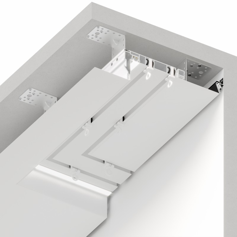 Новая система гардинного профиля разработана для механического карниза с двумя рядами. Первый ряд предназначен для штор, второй для тюля. Профиль выполнен из цельного алюминия. Карнизная система образует нишу благодаря специально разработанному выступающему краю. Таким образом, бегунки скрыты от глаз, видимой частью остается только сама штора.