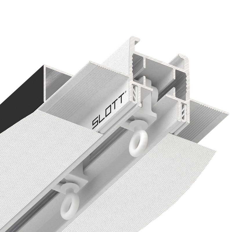 Система SLOTT Motion – это система карнизов для штор, которая полностью монтируется в запотолочное пространство и позволяет скрыть технические элементы механизма открытия и закрытия штор без создания специальных ниш. Визуально карниз выглядит как «прорезь» в потолке шириной 17 мм, в которой расположены крючки крепления штор. Основанная на узле SLOTT карнизная система SLOTT Motion гармонично и легко монтируется в любые виды натяжных потолков (ПВХ, ткань). А специальные «крылья» карнизного профиля SLOTT Motion позволяют смонтировать его и в гипсокартонные потолки. Базовой версией карнизной системы SLOTT Motion является «механическая», предполагающая открытие и закрытие штор вручную путем перемещения шторы за полотно.