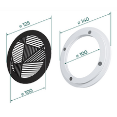 Магнитная вентиляционная решетка универсальная с косым ребром Подходят под трубу D100/125/150 D103 мм отверстие; D143 мм декоративный диск; Высота габарит 27 мм; 3 неодимовых магнита 8*3мм.